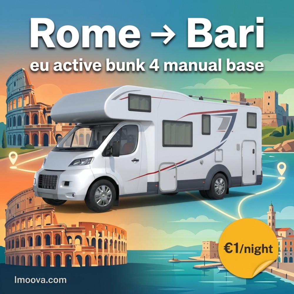 2 Nächte21+eu active bunk 4 manual base verfügbar für Einwegvermietung von Rome nach Bari. Flexible Verlagerung mit 4 Sitzen, Manuell Getriebe. Ab €1.00 pro Nacht.