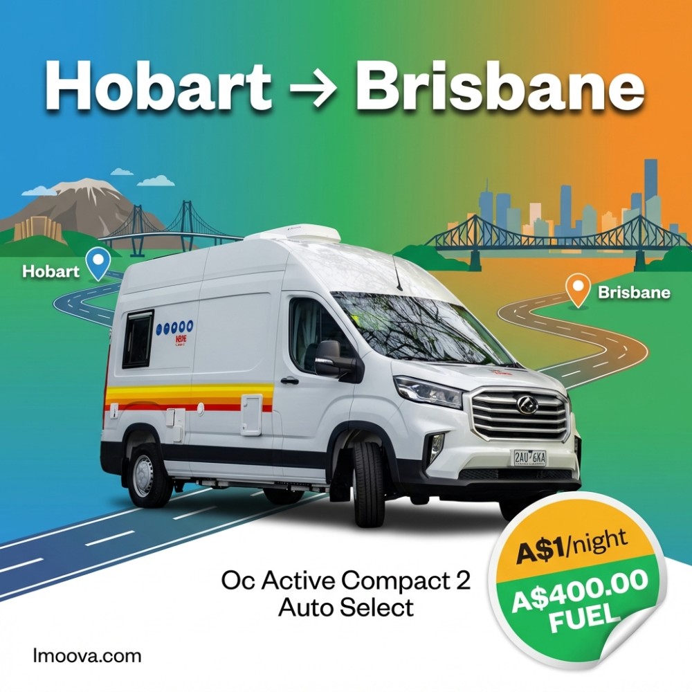 7 + 3 nights21+A$400.00Oc Active PopTop 4 Auto Select available for one-way rental from Hobart to Brisbane. Flexible relocation with 4 seats, Automatic transmission. Starting A$1.00 per night.