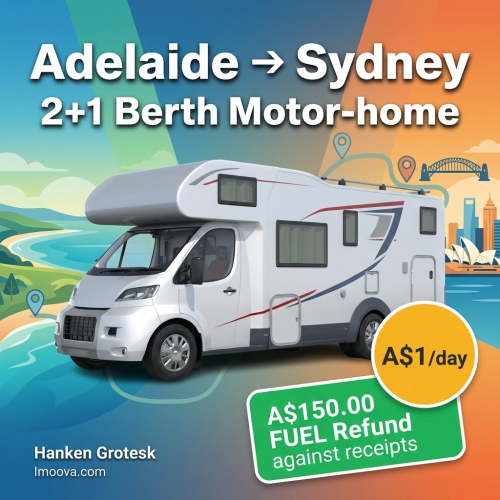 3 days21+A$150.002+1 Berth Motor-home available for one-way rental from Adelaide to Sydney. Flexible relocation with 3 seats, Automatic transmission. Starting A$1.00 per day.