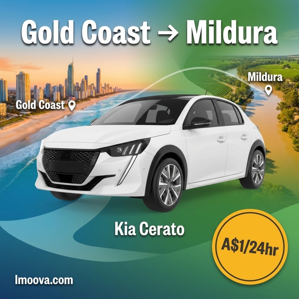 3 x24hrsKia Cerato available for one-way rental from Gold Coast to Mildura. Flexible relocation with 5 seats, Automatic transmission. Starting A$1.00 per 24hr.