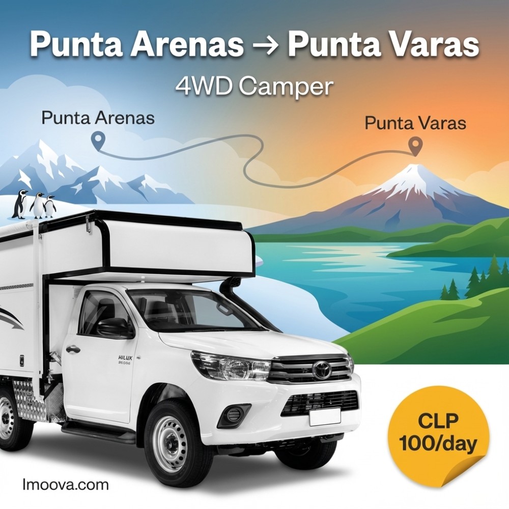 2 SeatsManual2 beds10 + 3 days18+4WD Camper available for one-way rental from Punta Arenas to Punta Varas. Flexible relocation with 2 seats, Manual transmission. Starting CLP 100 per day.