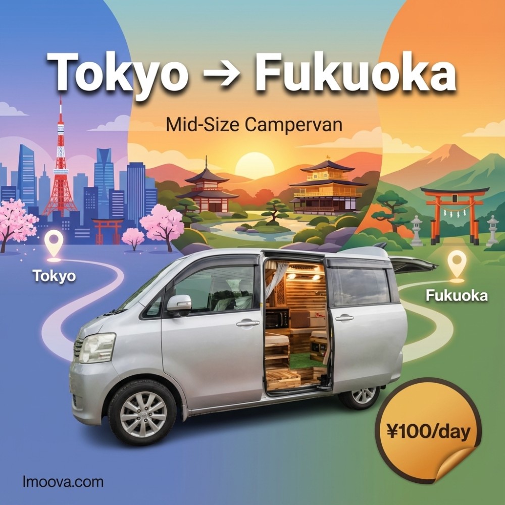 2 SeatsAutomatic2 beds1 day21+Mid-Size Campervan available for one-way rental from Tokyo to Fukuoka. Flexible relocation with 2 seats, Automatic transmission. Starting ¥100 per day.