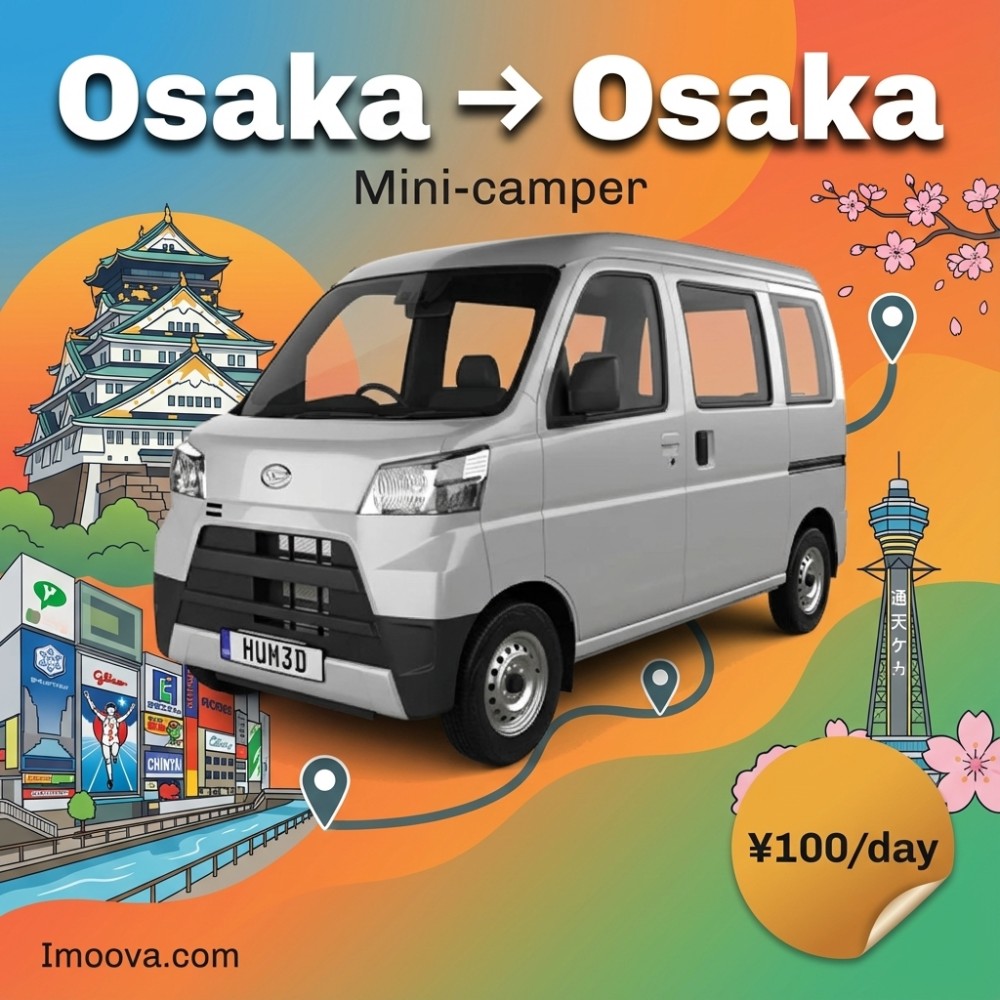 2 SeatsAutomatic3 + 30 days21+Mini-camper available for one-way rental from Osaka to Osaka. Flexible relocation with 2 seats, Automatic transmission. Starting ¥100 per day.