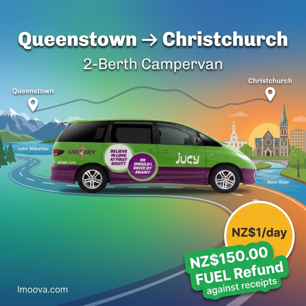 2 + 1 days18+NZ$150.002-Berth Campervan available for one-way rental from Queenstown to Christchurch. Flexible relocation with 2 seats, Automatic transmission. Starting NZ$1.00 per day.