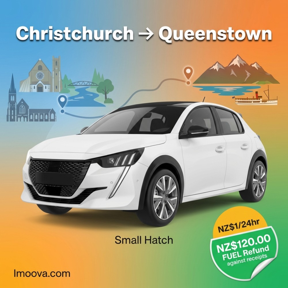2 x24hrs18+NZ$120.00Small Hatch available for one-way rental from Christchurch to Queenstown. Flexible relocation with 5 seats, Automatic transmission. Starting NZ$1.00 per 24hr.