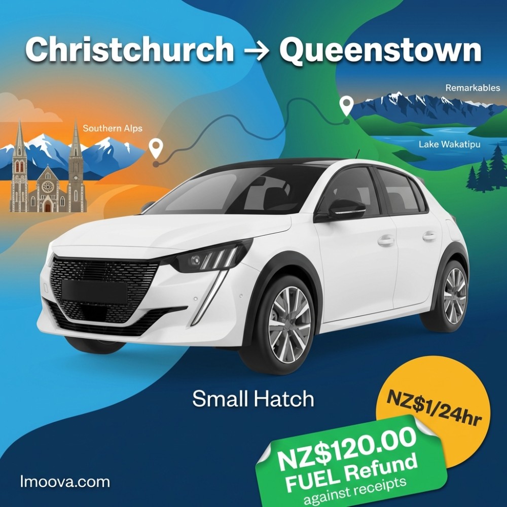 2 + 2 x24hrs18+NZ$120.00Small Hatch available for one-way rental from Christchurch to Queenstown. Flexible relocation with 5 seats, Automatic transmission. Starting NZ$1.00 per 24hr.