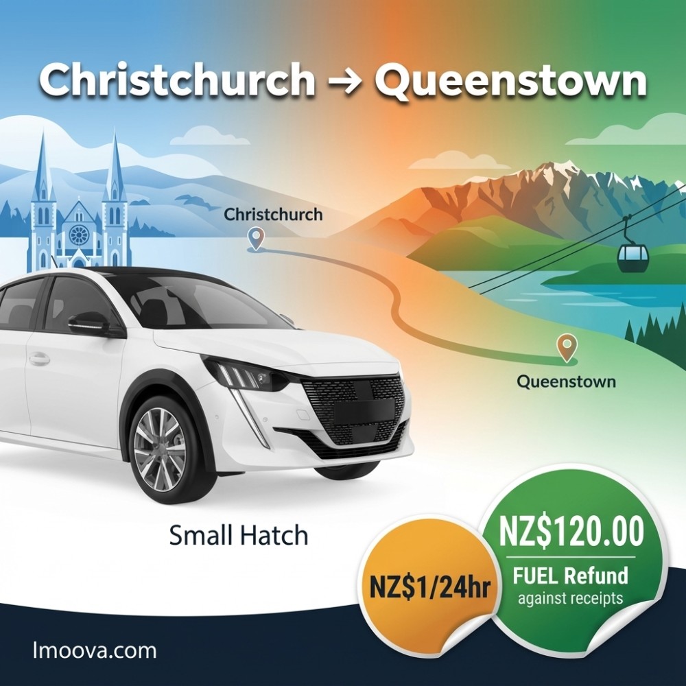 5 SeatsAutomatic2 + 2 x24hrs18+NZ$120.00Small Hatch available for one-way rental from Christchurch to Queenstown. Flexible relocation with 5 seats, Automatic transmission. Starting NZ$1.00 per 24hr.
