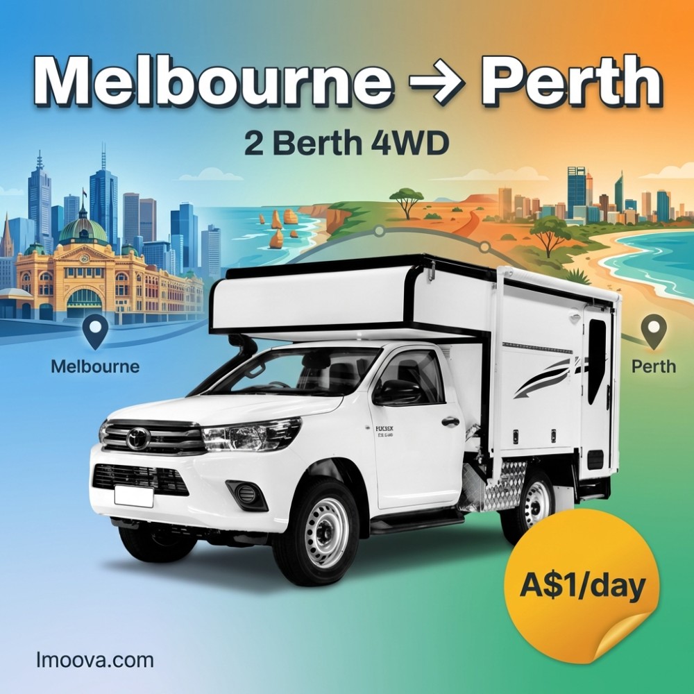 7 + 1 días21+2 Berth 4WD disponible para alquiler de ida desde Melbourne hasta Perth. Reubicación flexible con 2 asientos, transmisión Automático. Desde A$1.00 por día.