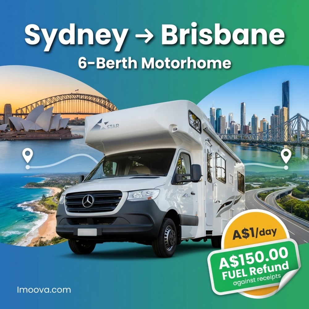 3 + 1 日 21+A$150.006-Berth MotorhomeがSydneyからBrisbaneへの片道レンタル可能。6席の柔軟な移動、オートマチックトランスミッション。日あたりA$1.00から。