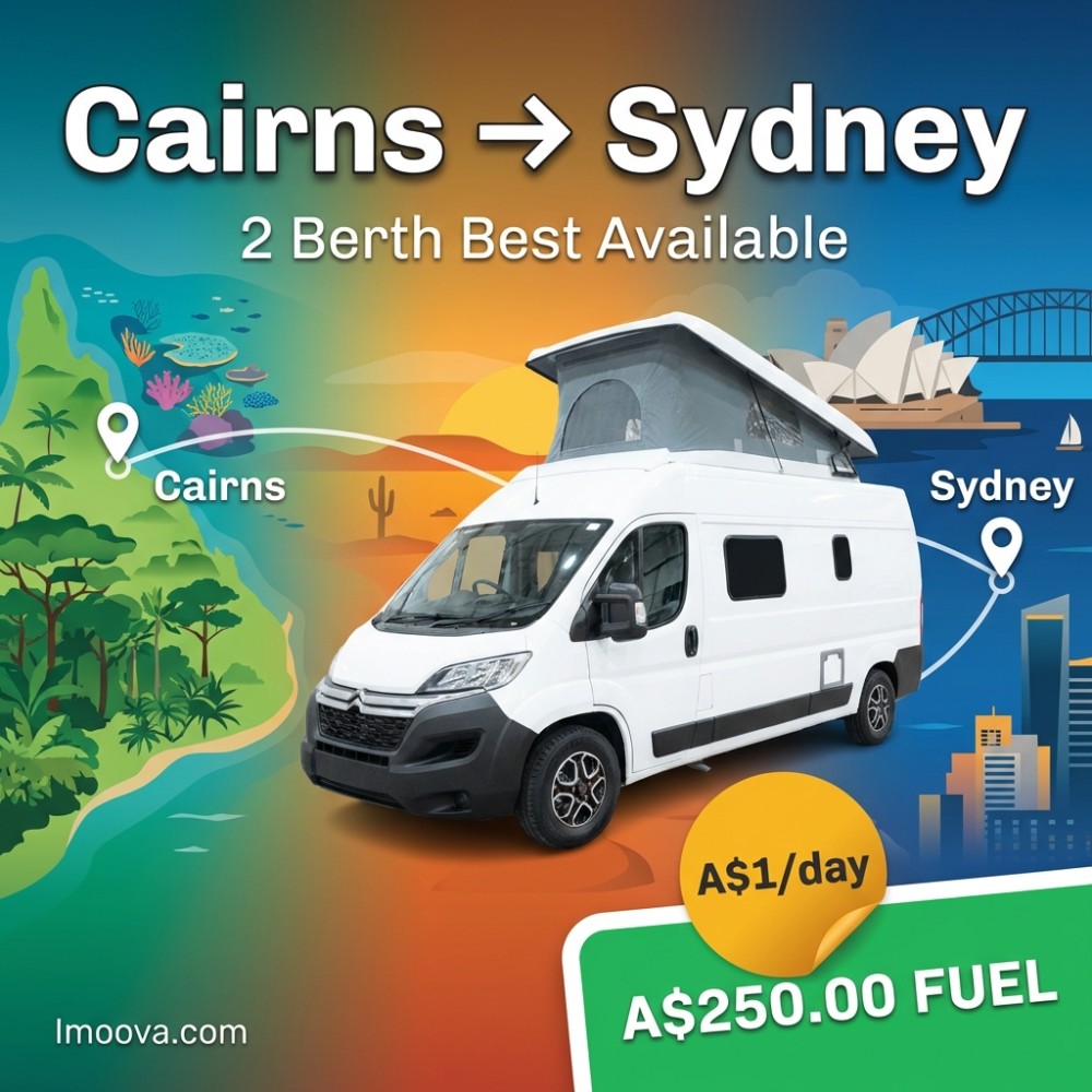 6 + 1 日 21+A$350.006 Berth MotorhomeがCairnsからSydneyへの片道レンタル可能。6席の柔軟な移動、オートマチックトランスミッション。日あたりA$1.00から。